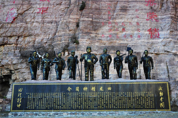 回龍精神由回龍村黨支部書記張榮鎖于上世紀九十年代捐出百萬家資,帶領回龍村英雄的干部群眾集體創造的,是太行山人的堅韌、智慧和硬骨頭精神的體現。這個英雄的群體經過三年多的艱苦創業,戰天斗地,改造山河,在千仞絕壁上修通了8000米的絕壁天路,在百丈紅巖,堅如鋼鐵的峭壁上,鑿通了1000多米的S形隧道,創造了鄉村公路史上的奇跡。