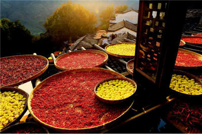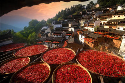 篁嶺是人文的杰作,數十棟古老徽派民居在百米落差的嶺谷錯落排布,家家鑿窗采光,戶戶支架曬物。村民們用眺窗為畫板,支架為畫筆,曬匾為調色盤,春曬茶葉、蕨菜;秋曬紅辣椒、稻谷黃豆……就這樣成就了一幅幅民俗風情杰作,一年四季延綿有序。