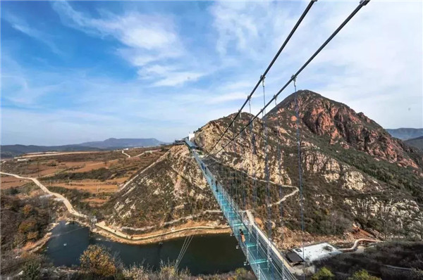 全透明高空3D玻璃吊橋,橋長255.6米,垂直落差80米,一橋飛架兩山,現代建筑藝術與自然山水景觀相存相依,完美呈現;橋上碧空流云、氣象萬千;橋下高峽平湖、碧波浩渺,于橋上行走,如漫步云端,一路尖叫,步步驚心。