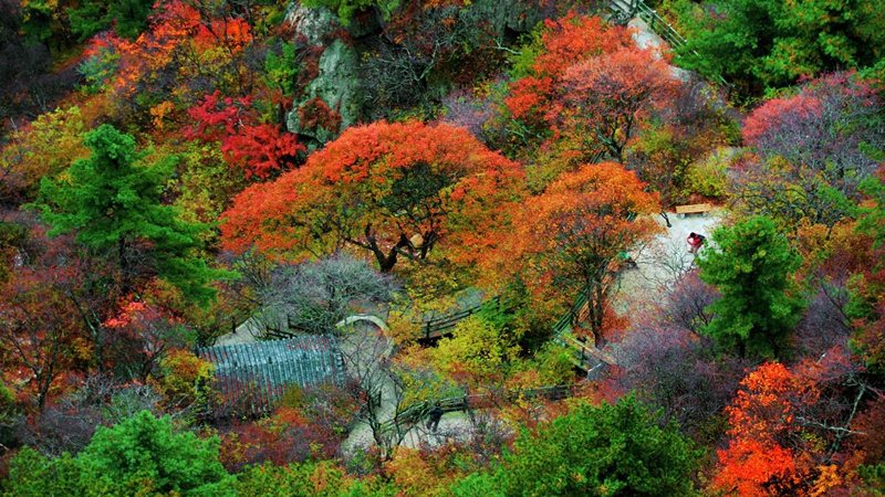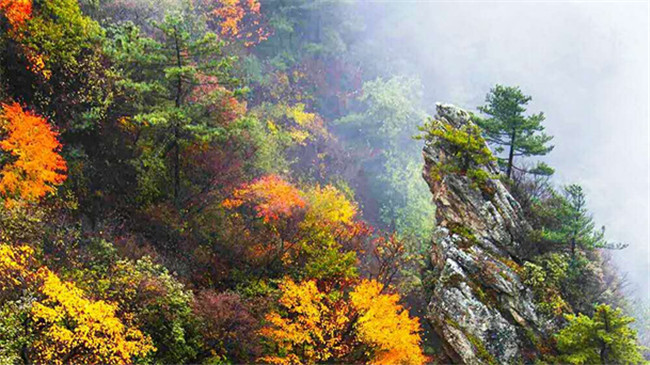 老君山的秋,五彩斑斕,豐富妖嬈,仿佛上天打翻了調色盤,就是為了賦予它如夢如幻的美——綠綠的松柏油亮依然,紅紅的楓葉秀的正艷,黃黃的枝葉熠熠生輝......秋天的老君山,恰似老子留下的五千箴言,返璞歸真,洗盡鉛華,秋已至,紅葉流丹待客來......