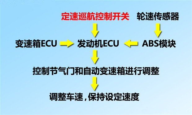 打開定速巡航開關后發(fā)動機ECU會接到信號,同時參考變速箱、輪速傳感器的信號(當前車速)、設定速度進行計算,最后調(diào)整節(jié)氣門開度和變速箱等控制單元對車速進行調(diào)整,實現(xiàn)巡航。