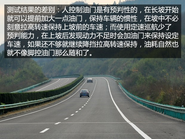 其實腳控比定速巡航省油,就差在上坡的時候了。人控制油門,如果有經(jīng)驗的話,在剛剛開始上坡的時候就會提前加大一點油門,保持車輛的慣性,在坡中不必刻意拉高轉速保持上坡前的車速,到坡頂后在利用慣性加油下行;而定速巡航的邏輯很簡單,保持設定的那個車速,電腦發(fā)現(xiàn)車輛的速度下降就會用加大油門提高轉速來保持設定速度,如果加油門還不行,就降一個擋位來拉高轉速,油耗自然也就不像腳控油門那么隨和了。那么,結論就有了:如果是路況好的大平路,定速巡航的油耗更經(jīng)濟,而上下坡比較多的路段使用定速巡航,定速巡航為了保持設定車速,加油和降擋等動作會更多,油耗自然也會出現(xiàn)上浮。