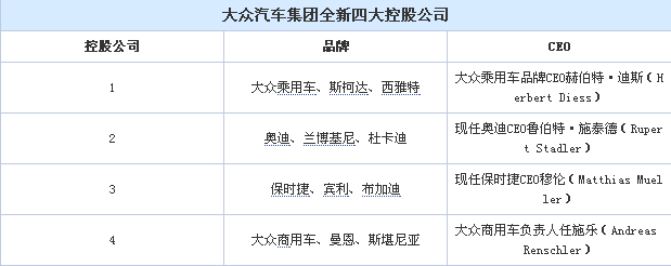 大眾汽車集團目前旗下共有12個品牌:大眾乘用車、斯柯達、西雅特為普通乘用車品牌;奧迪、保時捷、賓利為豪華/超豪華品牌;蘭博基尼、布加迪為超豪華跑車品牌;大眾商用車、曼恩、斯堪尼亞為商用車品牌;杜卡迪為摩托車品牌。這12個品牌也都將分別屬于四家控股公司所有。