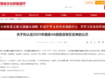 11月27日,河南省文化和旅游廳發布公示公告,擬認定香堤灣·奧帕拉拉水公園、黃河灣風景區、魏坡·新序景區、翔宇工業旅游景區等16家旅游景區為國家4A級旅游景區。