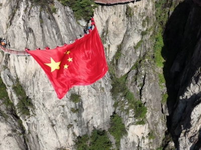 河南老君山懸崖絕壁展國旗, 五星紅旗的光芒定能照亮整個山谷,護旗手錚錚誓言喊出時代最強音