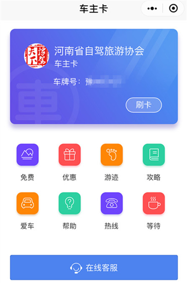 步驟一:抵達景區售票處,打開微信向下拉動,找到或搜索“自駕車主卡”小程序,也可以打開“河南自駕”微信公眾號的底端菜單“車主卡”,直接進入到小程序。