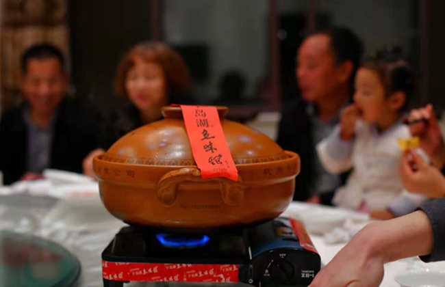 最能代表千島湖的菜非千島湖魚頭莫屬了,同時也是魚味館的鎮店菜。一個超大的砂鍋里裝著一個4斤左右的千島湖魚頭,經過幾個小時的燉煮,魚湯已經成奶白色,上面還有一層薄薄的魚油。這魚湯爽滑可口,魚肉油潤滑嫩,這應該是我吃過最好吃的魚頭湯了。雖然只是簡單的燉煮,但毫無泥腥味,應該和千島湖優越的水質有直接的關系。看大家的表情就知道有多好吃了。
