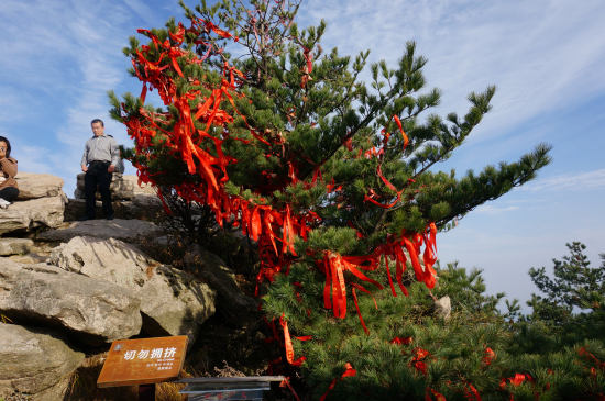 堯山山頂上的許愿樹上記滿了紅絲帶