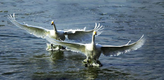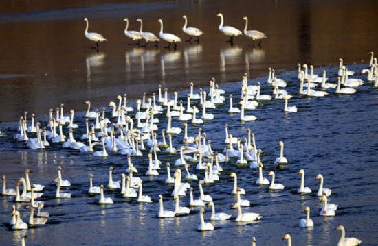 餐后,車友就迫不及待的到天鵝湖國家城市濕地公園,在三門峽庫區(qū)廣闊明澈、碧波蕩漾的湖面上,成千上萬只白天鵝自由自在地飛翔、飄游、嬉水、覓食,安詳?shù)匦摒B(yǎng)生息。這些圣潔的仙鳥,或飛、或游、或走、或臥、或睡、千姿百態(tài),構(gòu)成一副副動(dòng)人的畫面,招引的車友爭相觀賞,拍照留影。