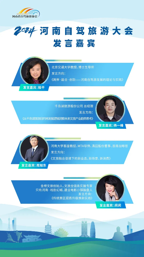 大會邀請了多位行業領袖和知名專家進行主旨演講,包括北京交通大學殷平教授、千島湖旅游股份公司楊一峰總經理、清明上河園首席戰略官周旭東先生、只有河南·戲劇幻城、建業電影小鎮操盤人閔閔女士等,陣容強大,他們將分別就交旅融合的合理路徑、千島湖旅游演藝的經驗、文旅行業新業態和新趨勢等話題進行深入分享,展開一場關于“自駕旅游”的極致探討盛會。