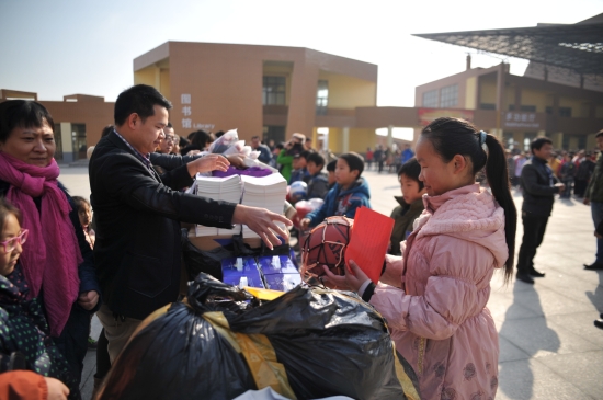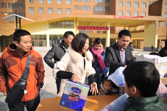 河南花花牛乳業(yè)的代表王真真為貧困兒童逐一分發(fā)了花花牛新乳制品——高加索。