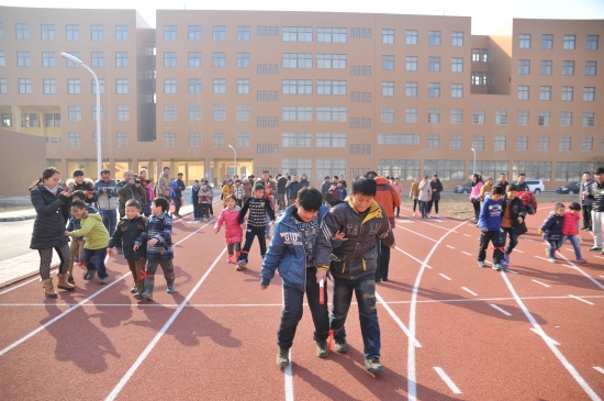 車友們和孩子們一起跳繩,陽光把車友和孩子們的影子一起印在了歡樂的操場。