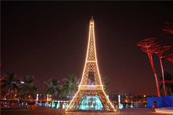 2015年10月19日,近日,海南省海口市海甸溪旁冒出一座山寨“埃菲爾鐵塔”引起了市民關注。據現場看護人員介紹,這座山寨版“埃菲爾鐵塔”高約20米,外表刷金色油漆,晚上還有輪廓燈,主要是供市民觀賞拍照。