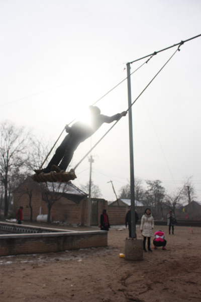 地坑院旁一個老鄉(xiāng)在蕩秋千,周圍車友都紛紛豎起了大拇指,蕩這么高,實在太厲害了!