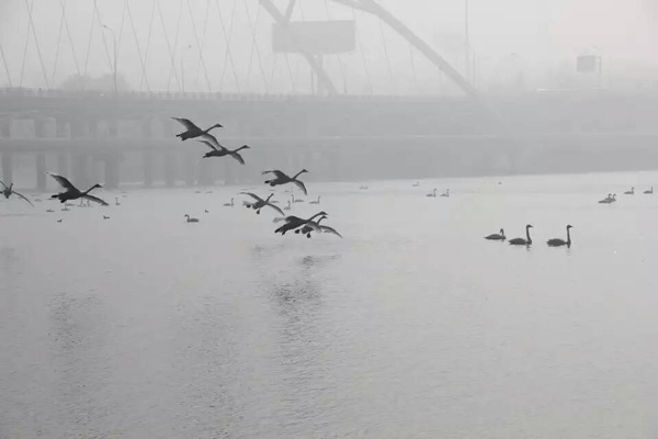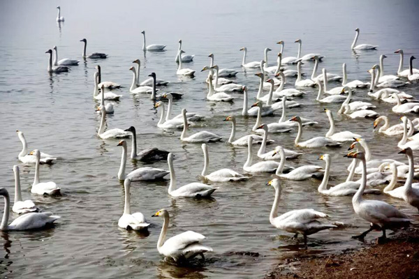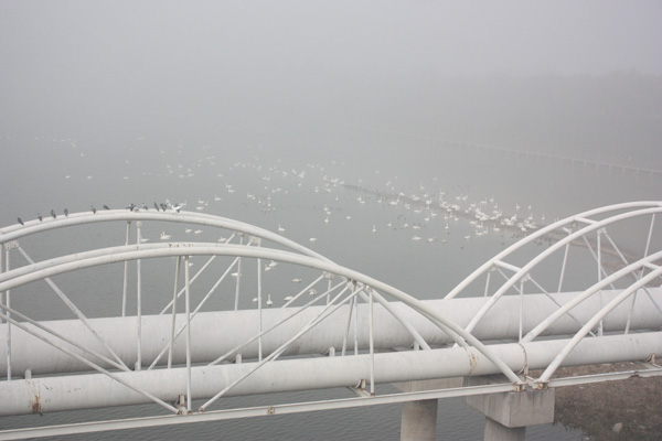 十一點多,大霧散了些,車隊又回到天鵝湖。這次,終于可以看到白天鵝的廬山真面目。