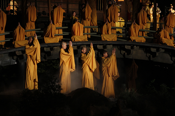 佛曰:不可說(shuō),不可說(shuō),《禪宗少林·音樂(lè)大典》卻有魔力把高深玄妙的禪演繹出來(lái)?!抖U宗少林》總制作人梅帥元接受中央電視臺(tái)采訪時(shí)說(shuō):“《禪宗少林·音樂(lè)大典》不是少林的武術(shù)表演,也不是劇場(chǎng)里看到那種演出,首先說(shuō),它應(yīng)該是在嵩山的峽谷之間制作的一臺(tái)以中原文化為核心的演出,這個(gè)演出充滿一種禪的意味,我們說(shuō)少林的武術(shù),我們看到里面有,但更重要的是我們要用中國(guó)禪的這種文化來(lái)引領(lǐng)少林武術(shù),使它達(dá)到一種境界?!?易中天老師說(shuō),禪宗不主張像出家人講的四大皆空,禪宗講不離世間覺(jué),就是說(shuō)人在世俗的生活中同樣可以覺(jué)悟,這就給《禪宗少林,音樂(lè)大典》一個(gè)很大的創(chuàng)作空間,可以表現(xiàn)世俗生活的美麗,只要他有禪意。