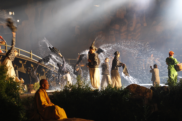 《禪宗少林·音樂(lè)大典》是由譚盾、梅帥元、釋永信、易中天、黃豆豆五位大師聯(lián)袂打造 的一臺(tái)大型山地實(shí)景演出,共分《水樂(lè)·禪境》、《木樂(lè)·禪定》、《風(fēng)樂(lè)·禪武》、《光樂(lè)·禪悟》、《石樂(lè)·禪頌》五個(gè)樂(lè)章,生動(dòng)地描述了山澗風(fēng)景、雪夜古 剎、月照塔林、頌禪法會(huì)、溪山坐禪、少林拳棍、女童牧歸等情景。演出規(guī)模宏大,音畫一體,近600人的禪武演繹,少林僧侶的現(xiàn)場(chǎng)唱頌,春夏秋冬的四季變 化,直指心性的佛樂(lè)禪音,合成了中岳嵩山的輝煌交響,為中外游客提供了一把解讀禪文化奧秘的鑰匙和洗滌心靈的靜土。