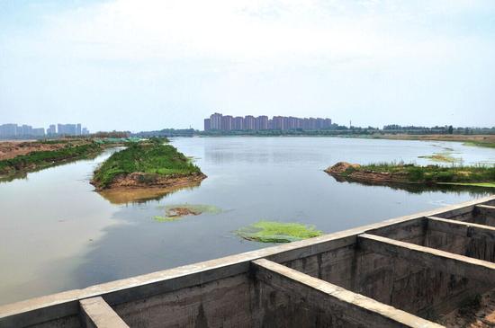 昨日上午,記者來到鄭開大道與錦繡大道東北角的象湖,離湖水還有幾百米處就聞到空氣中飄來的腥臭味。這里是楊橋干渠與賈魯河的交匯處,干渠干枯,賈魯河西側有村民從象湖抽水灌溉已經收割的麥田。賈魯河黑色的河水流入象湖,靠北另一條水渠則是黃色的水流入湖中,兩股水流在湖面上交匯,形成黑黃兩種顏色,對比非常分明。