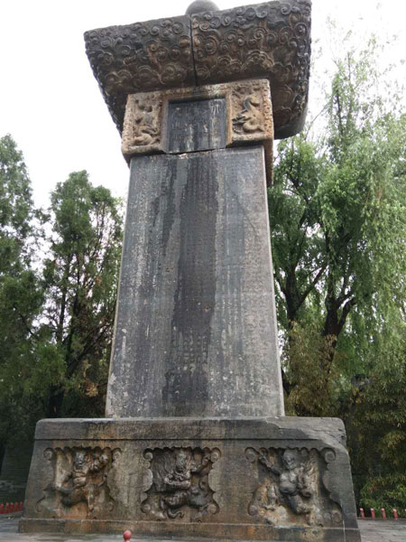 大唐碑,重80多噸,僅碑帽就有10多噸重,李林甫撰文,內容主要敘述嵩陽觀道士孫太沖為唐玄宗李隆基煉丹九轉的故事。據導游介紹,碑文的兩旁和后面的刻字都是后世文人添加上去的,皆為諷刺、批判李林甫所刻文章。