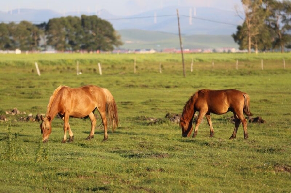 遼闊的烏蘭布統(tǒng)大草原,藍(lán)天白云下,駿馬奶牛悠閑的吃著青草!