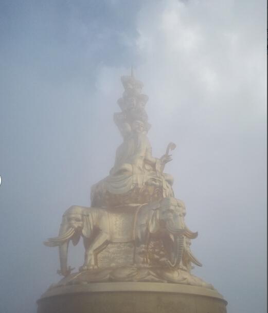 當下午五點左右采風團坐上通往金頂的索道,穿過云霧飄渺的云層,到達海拔三千多米的金頂時,氣溫忽地變的涼爽起來,這個時間點到達山頂聽導游說大家碰運氣吧,時間稍微有些晚了而且這兩天預報陰天,其實不抱太大希望看到云海。但是當我們到達金頂后不到五分鐘時間,陽光穿透云層,十方普賢、云海、金頂都一一浮現,真是佛光普照,萬里云層被鍍上金光、似夢境之迷離。導游一直在說你們真有佛緣啊!游客們也被這佛海及云海的奇觀所震撼,拿著各種拍照神器不斷的咔嚓起來,為了更多地留下這驚艷時刻,對著十方普賢許下美好愿望。